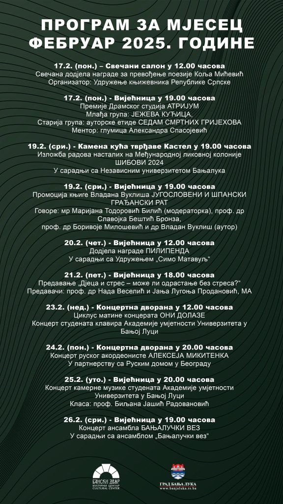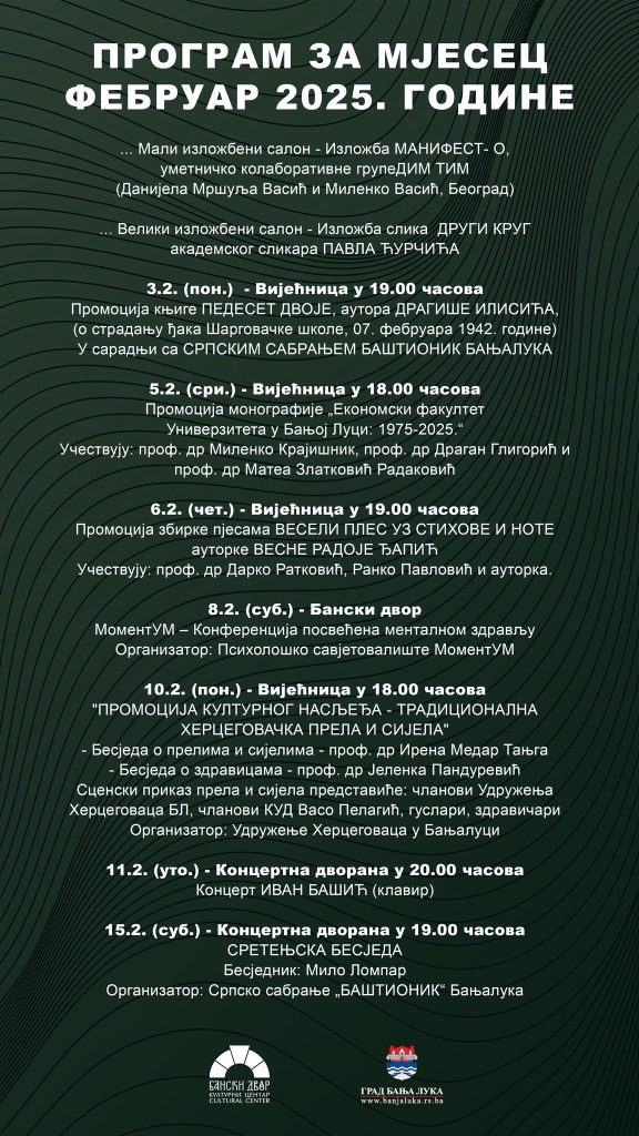 Културни центар „Бански двор“ Бања Лука објавио је богат програм који све грађане града на Врбасу очекује током мјесеца Фебруара 2025. године.