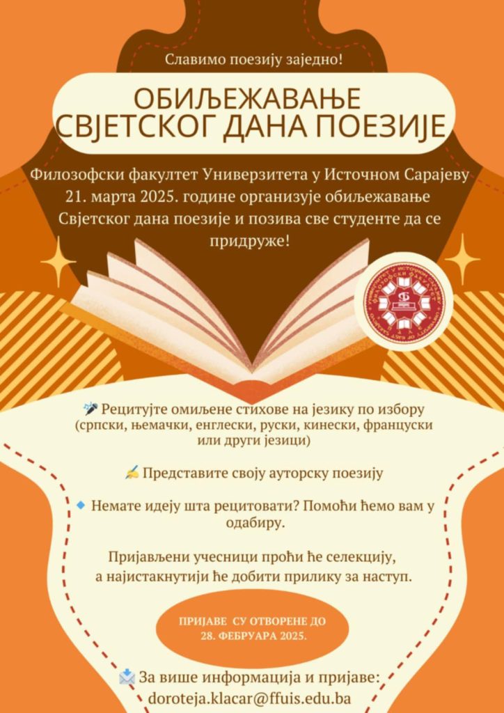 Филозофски факултет позвао је студенте да узму учешће у обиљежавању Свјетског дана поезије који ће бити обиљежен у овој установи 21. марта 2025. године.