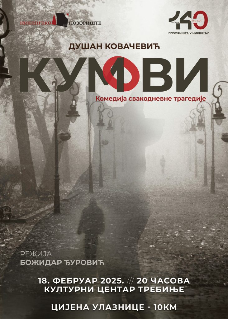 Представа Никшићког позоришта „Кумови“, коју је по драмском тексту Душана Ковачевића из 2012. године режирао Божидар Ђуровић биће изведена у позоришту Културног центра Требиње, у уторак 18. фебруара у 20 часова – најављено је из Културног центра Требиње.