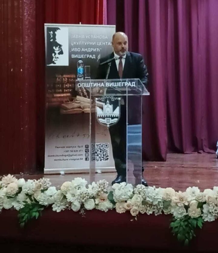 Он је истакао симболику моста у Вишеграду и снагу књижевне ријечи која је том споменику подигла културни и историјски значај.