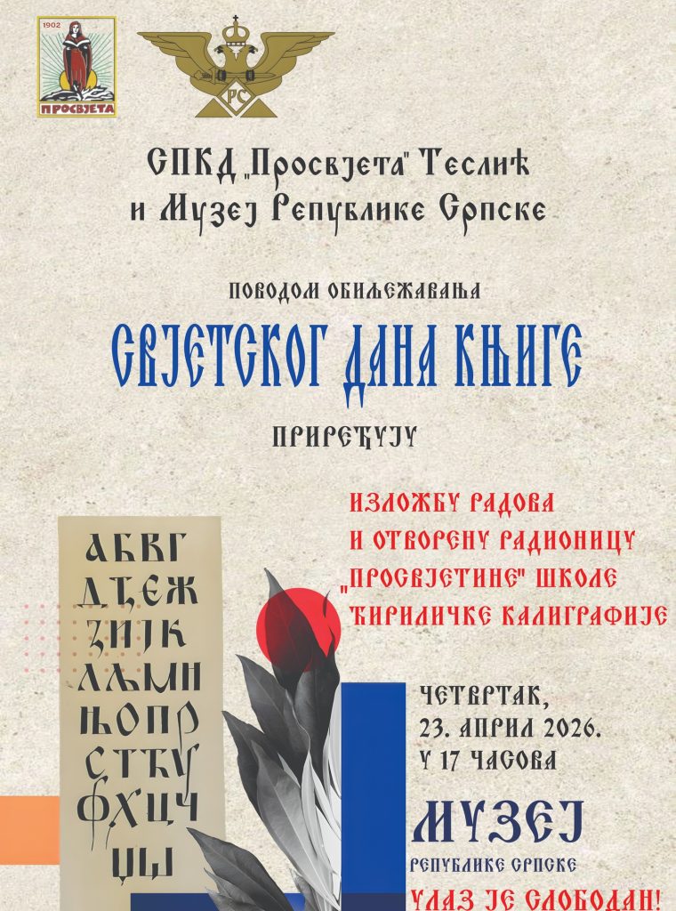 Свјетски дан књиге, у Музеју Републике Српске, у четвртак, 23. априла 2026. год, од 17 часова, биће обиљежен посебним тематским програмом у организацији СКПД Просвјета Теслић.