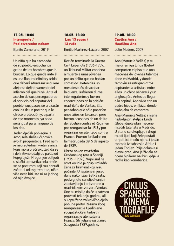 Циклус шпанске кинематографије, у сриједу, 15. маја у 20 часова отвара филм “Сретна звијезда”, режисера Рикарда Франка. Наредни филмови, “Yuli”, редитељке Исијар Болајн, “Под отвореним небом”, Бенита Замбрана, “13 ружа” Емилија Мартинеза-Лазара и “Хаоточна Ана” Хулија Медема биће приказани у термину од 18 часова.