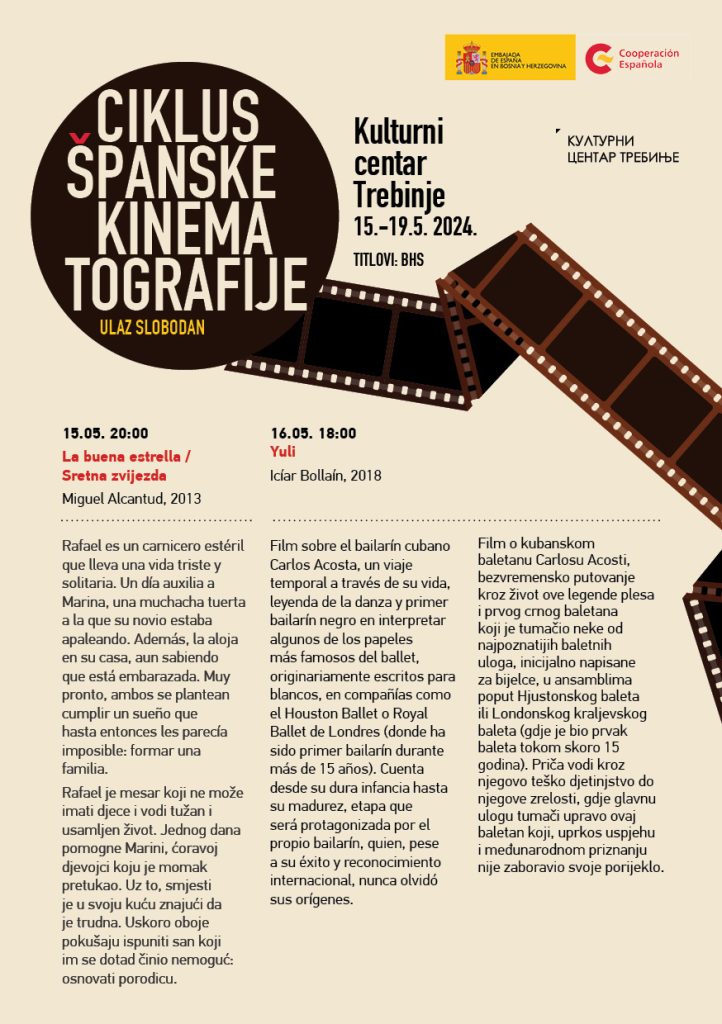 Амбасада Краљевине Шпаније у Босни и Херцеговини и Културни центар Требиње од 15. до 19. маја у биоскопу Културног центра Требиње организују “Циклус шпанске кинематографије”, у оквиру кога ће бити приказано пет филмских остварења – саопштени је из Културног центра Требиње.