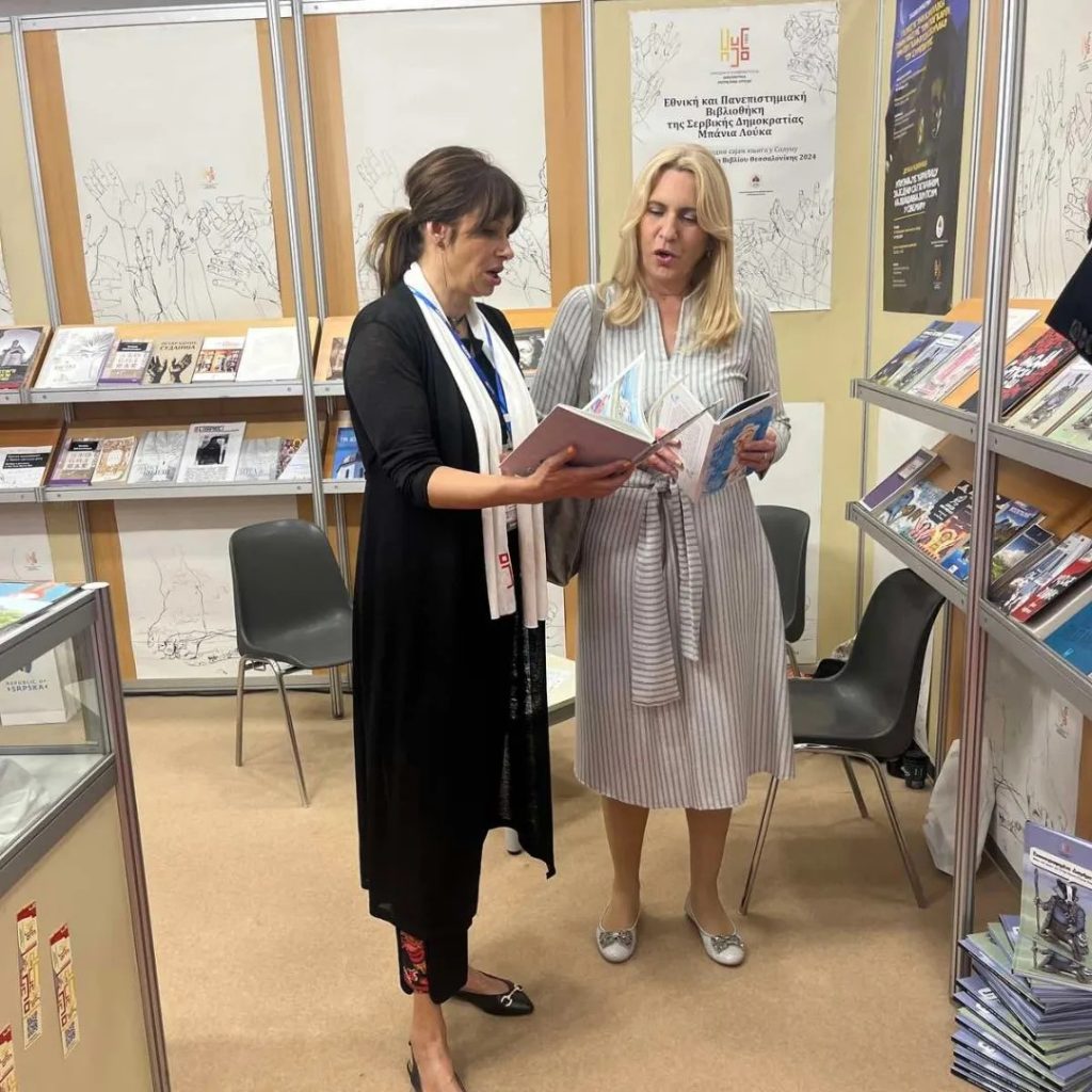 Српски члан Предсједништва БиХ Жељка Цвијановић посјетила је данас штанд Народне и универзитетскe библиотекe Републике Српске на 20. Међународном сајму књига у Солуну.