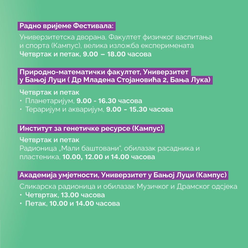 имати прилику да посјете планетаријум, акваријум и тераријум у терминима од 9.00 до