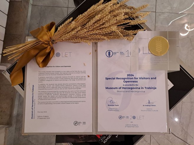 Музеј Херцеговине у Требињу добитник је значајног признања, награде за најбољи музеј словенских земаља у конкуренцији 20 музејских установа из 10 земаља.
